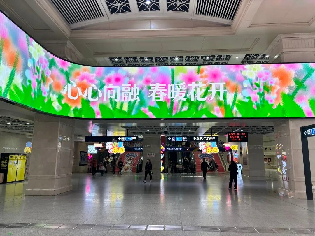 站厅内,一块全长约154.5米,面积371.06㎡的环形数字大屏前,此前行色匆匆的乘客们也忍不住驻足。