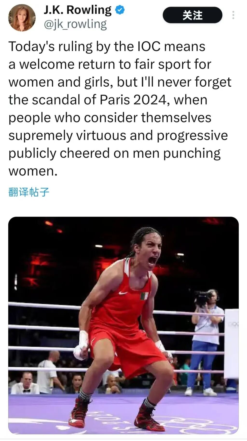 最近几年一直在竭力维护“生理女性”权益的“哈利·波特”系列小说作者J.K.罗琳也在社交网站上发文:“国际奥委会今日的裁决,意味着女子体育终于有望回归公平,这值得欢迎。但我永远不会忘记2024年巴黎奥运会的丑闻,当时那些自诩道德高尚、思想进步的人,竟公开为男人拳打女人的场面叫好。”然而这篇推文底下,一如既往,大多数留言仍在抨击谩骂罗琳,将其视为“女性叛徒”。