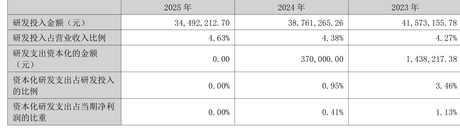 2025年全年,公司研发投入金额为3449.22万元,同比下降11.01%;研发投入占营业收入比例为4.63%,相比上年同期上升0.25个百分点。此外,公司全年研发投入资本化率为0%。