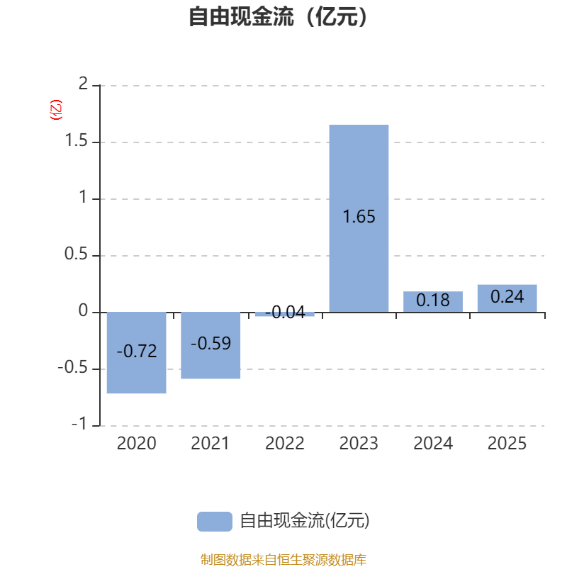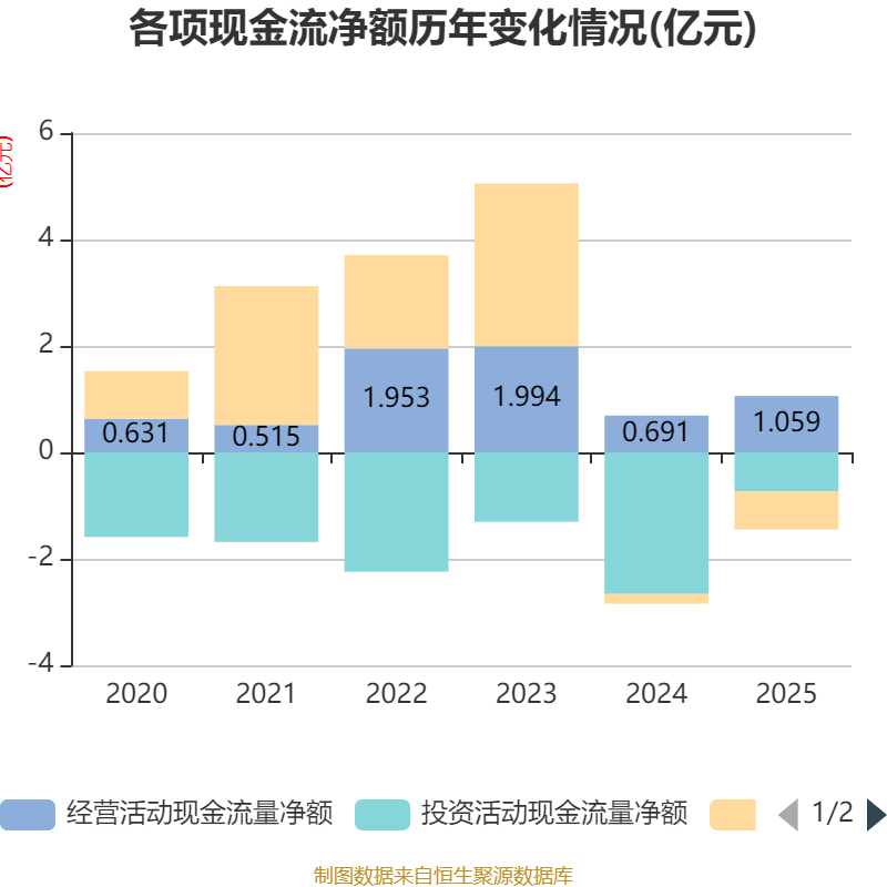 截至2025年,公司经营活动现金流净额为1.06亿元,同比增长53.22%;筹资活动现金流净额-7197.68万元,同比减少5355.75万元;投资活动现金流净额-7323.76万元,上年同期为-2.66亿元。