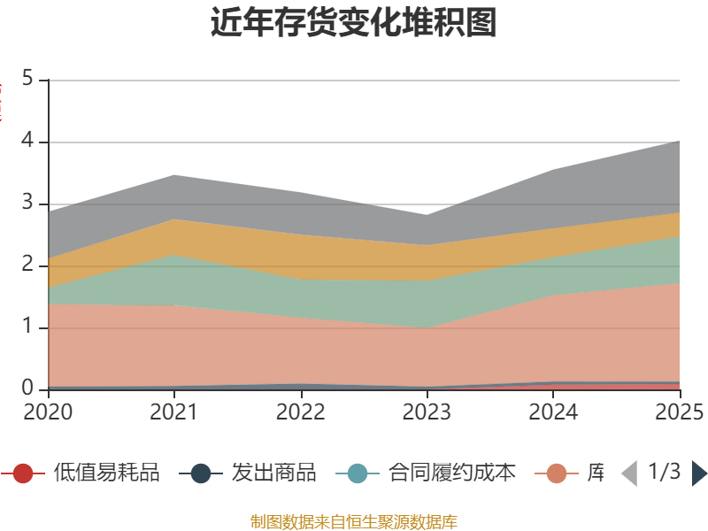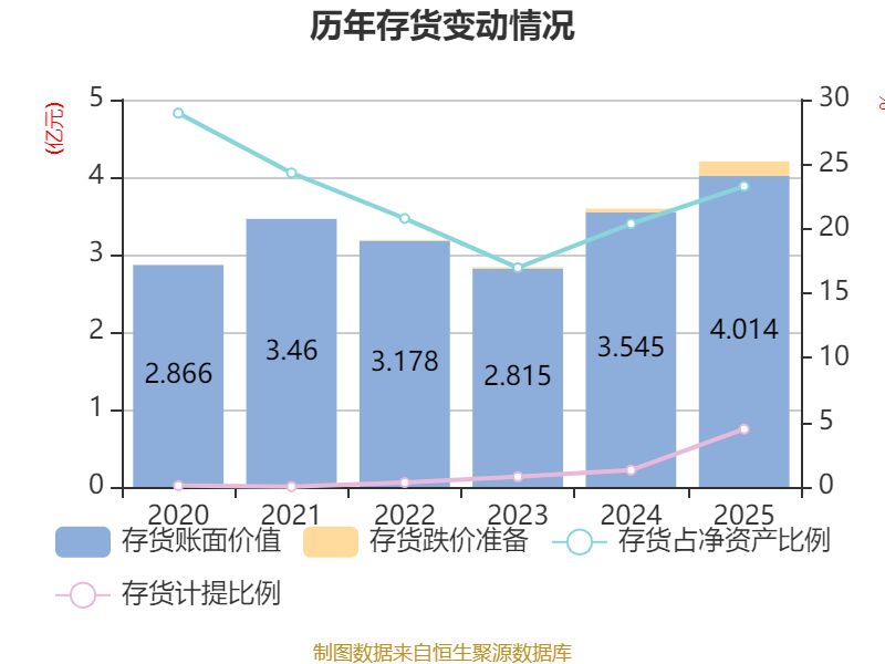 从存货变动来看,截至2025年末,公司存货账面价值为4.01亿元,占净资产的23.29%,较上年末增加4690.39万元。其中,存货跌价准备为1880.69万元,计提比例为4.48%。